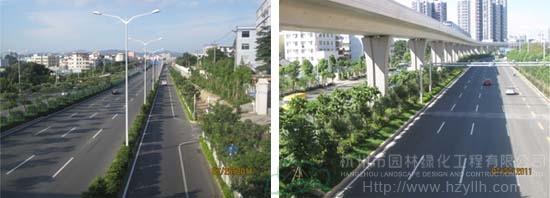 國道205深圳段改建工程景觀綠化工程G5402標段,是深圳市龍崗區(qū)迎大運重點景觀工程,位于國道205深圳段龍崗區(qū)地鐵三號線愛聯(lián)地鐵站至坪地與惠州市交界處,總綠化面積210000㎡。“以人為本,尊重自然”、“ 處處有綠葉、無處不飛花”等設計理念貫穿于工程始終,整條中央綠化帶位于高架橋下,長勢茂盛的各類植物形成一條色彩繽紛的彩帶擁簇著高架橋段,使整條橋段與綠化景觀有機融合。整條道路的景觀,不僅體顯出一個濱海大都市獨有的景觀特色,更彰顯出這個城市的生機活力與熱情奔放。