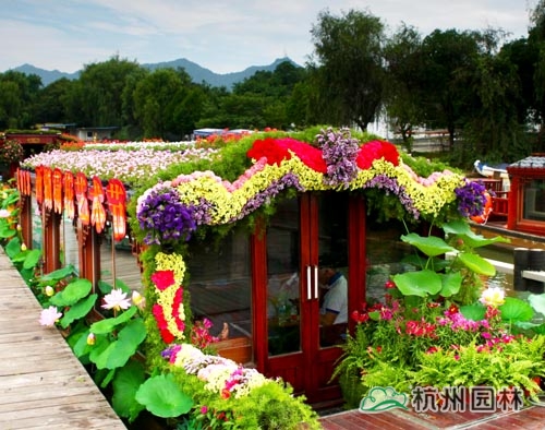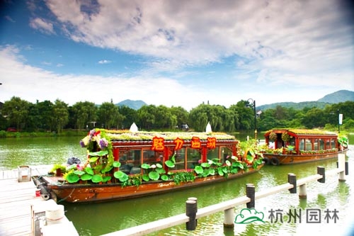 藝術(shù)節(jié)期間,首次在西湖湖面上配置6艘荷花花船,極大地提高了荷花節(jié)的觀賞性和趣味性,成為西湖中一道流動的荷花美景。其中,由杭州市園林綠化股份有限公司設(shè)計(jì)制作的“魅力西湖”荷花游船,將插花技藝與園林布景手法有機(jī)結(jié)合,用康乃馨、勿忘我、太陽花等與荷花組景,既突顯了“主角”荷花的秀麗、典雅,又使整艘船的色彩明艷豐富,將熱鬧的節(jié)日氛圍巧妙烘托。