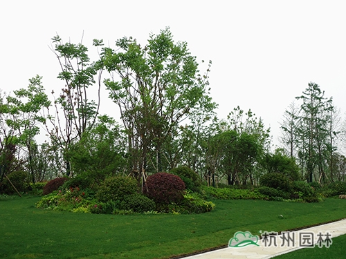 在1號樓和2號樓之間,植物配置講究的是層次的錯(cuò)落有致、季相色彩的豐富多變、天際線的分明起伏、林緣線和草坪線的視覺流暢,遵循大自然本身的多樣性、群落性、生態(tài)性的原則,營造出對比強(qiáng)烈、富有節(jié)奏和韻律感的園林景觀。其中,高層主要用榔榆、香樟、櫸樹、落羽杉,中層用桂花、紅楓、雞爪槭、白玉蘭,低層用紅梅、石楠、紅花檵木等,在有限的空間里,營造出變化多端的園林景致,特別是大規(guī)格造型植物的應(yīng)用,更是起到了畫龍點(diǎn)晴的作用。