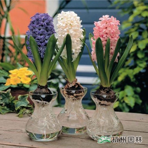 風(fēng)信子:目前市場上常見的風(fēng)信子有粉、藍(lán)、玫紅、紫、白等品種,其中以藍(lán)、粉、紫最受歡迎。選購時(shí)要挑個(gè)頭大而飽滿的,抓在手上硬實(shí)偏重,根部不發(fā)霉,生長點(diǎn)未受破壞的種球。11月下旬種植,在陰冷的環(huán)境下放置兩個(gè)月左右,這樣處理可以減少后期夾箭的概率,也有利于根系的生長,待花芽長至5cm左右時(shí)移至光線充足的區(qū)域即可。風(fēng)信子也可水培,但較盆栽一般花箭短、花朵少,花期也會(huì)短一周左右。