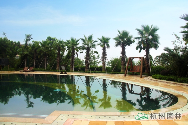 露天泳池區(qū)景觀獨具特色,選用華棕、棕櫚、布迪椰子、加拿利海棗等熱帶植物作為主景,營造出簡約大方、層次分明的濃郁熱帶園林風(fēng)情。為了提高這些熱帶植物的成活率,降低后期的養(yǎng)護成本,這批植物都經(jīng)過馴化,較能適應(yīng)吳江的氣候條件。該區(qū)面積較大,從酒店的觀景平臺上往下看,泳池中間的小島就像彎彎的小船,仿佛要順流而下;水質(zhì)清澈見底,水底大面積的藍色和黃色玻璃馬賽克,營造出波光鱗鱗的效果,偶有微風(fēng)吹來,水面蕩起陣陣漣漪,流動的線條瞬間充滿了生機和活力,整個泳池仿佛都動了起來。岸邊的植物高大茂密,郁郁蔥蔥,透過樹叢的間隙,浩渺無邊的太湖水系與遠(yuǎn)處的天際線連接在一起,恍然之間,好象是來到了充滿陽光、海浪、沙灘的南國熱帶海域,心情的舒暢不言自喻。