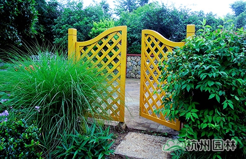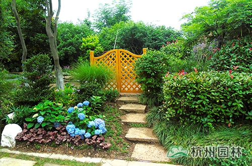 門口安裝高1.2m、寬1.5m的對開推入式木門,以此吸引游人眼球;花園入口采用常綠灌木、花灌木、宿根花卉相結(jié)合的手法,將花園內(nèi)的景觀進(jìn)行了遮擋,同時(shí)營造出引人入勝的入口景觀。