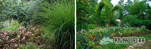 入口視線落腳點(diǎn)以粉黛亂子草+大濱菊花帶為中景,以紫絨鼠尾草+亞麻“紅劍”+微型月季“玫紅”為前景,在細(xì)葉芒的掩映下,將花園內(nèi)部形成若隱若現(xiàn)的效果;木香花架側(cè)采用花帶式種植,利用粉黛亂子草可達(dá)1.5m以上的枝葉進(jìn)行空間分割,形成既與周圍環(huán)境風(fēng)格統(tǒng)一又相對私密的花園獨(dú)立空間。并采用大濱菊做邊緣隔離、金線石菖蒲做填充,既限定了粉黛亂子草的生長區(qū)域,又增加了景觀多樣性。
